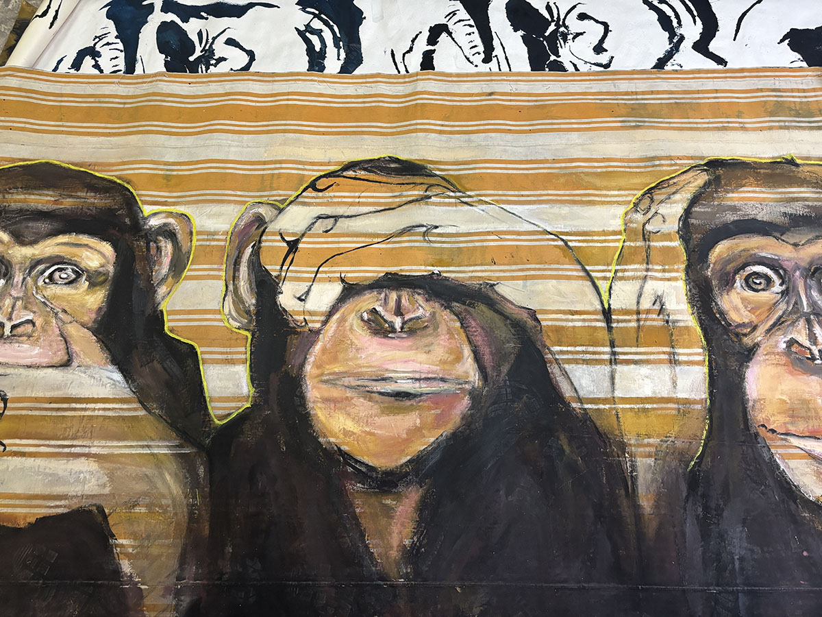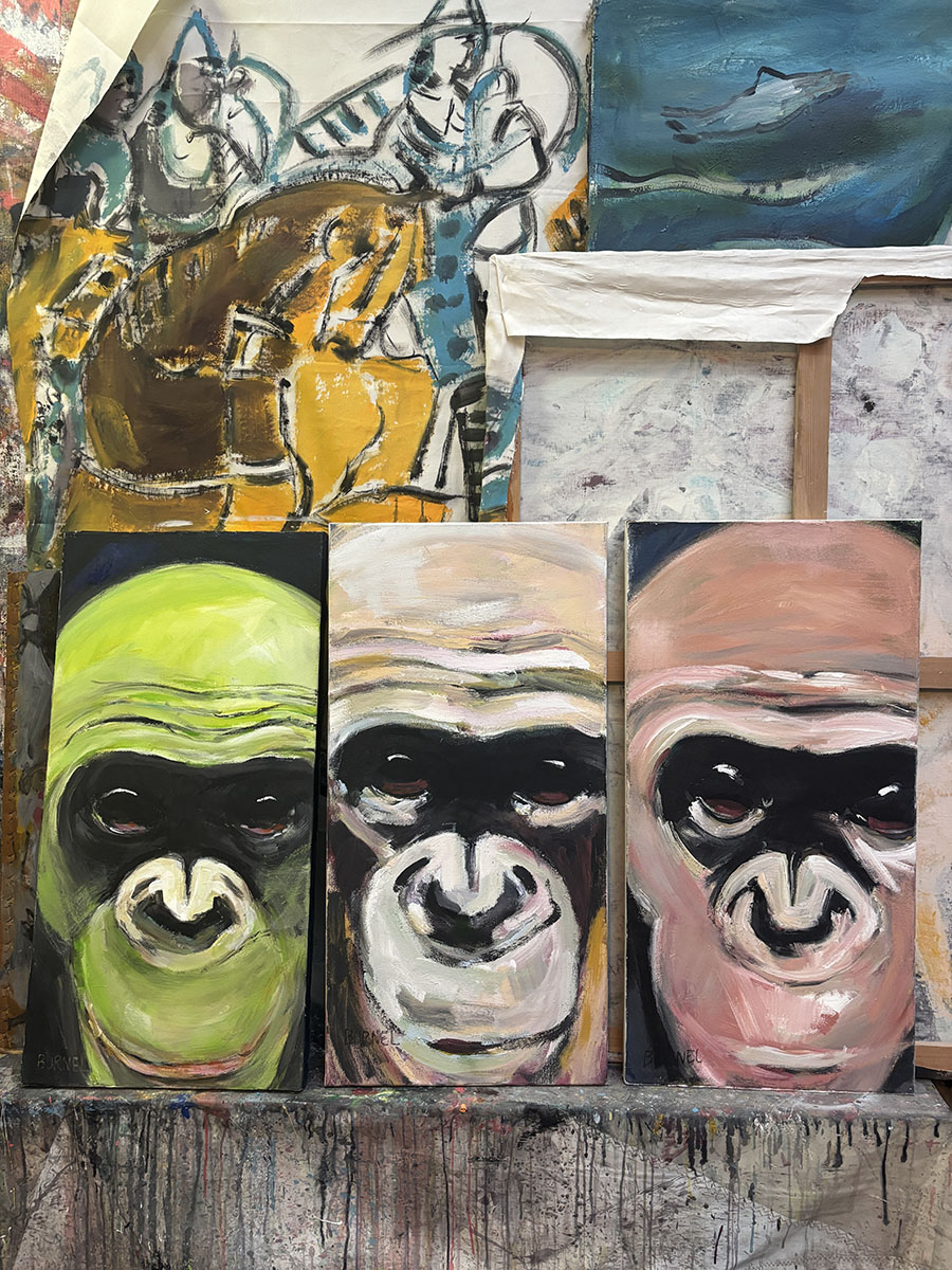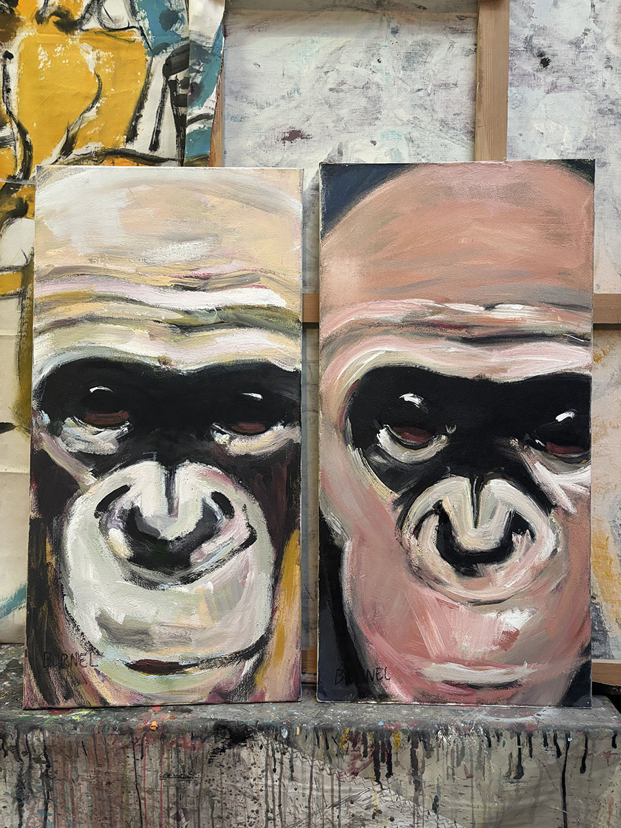 Parmi ses cycles les plus marquants, la série des Bonobos révèle une attention particulière au regard et à la présence. Les visages de primates, cadrés de près, deviennent presque des portraits humains, prétextes à un travail de texture, de rythme et d’énergie picturale. À l’opposé, son Chemin de Croix propose une relecture personnelle de la figure du Christ, où la spiritualité naît davantage de la matière et du mouvement que de la narration religieuse.